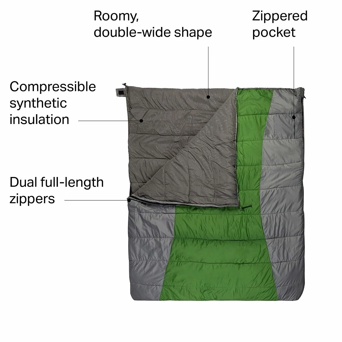With the Alps Mountaineering Double Wide 20 Degree Sleeping Bag, there’s plenty of space for us and an adventure buddy to enjoy a comfortable night’s sleep in the outdoors. The spacious 68-inch width also gives us room to roll over when our partner is apparently having an action-packed dream and we’re caught in the crossfire. The Double Wide’s 20-degree rating serves us well for three seasons of the year, and the synthetic insulation keeps us warm even if it gets wet.