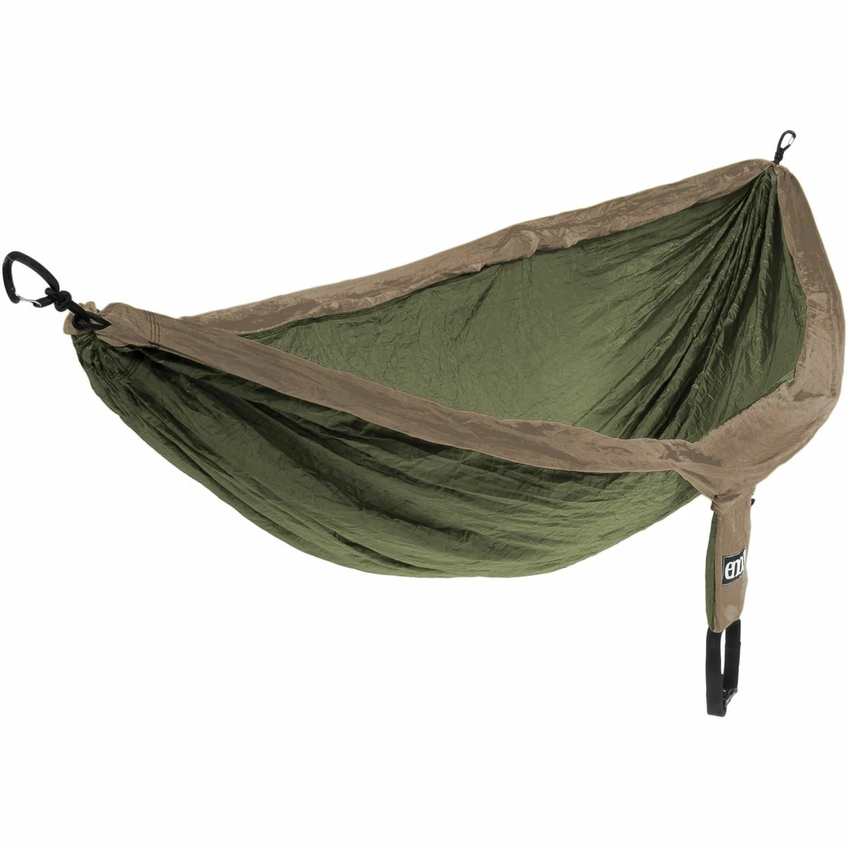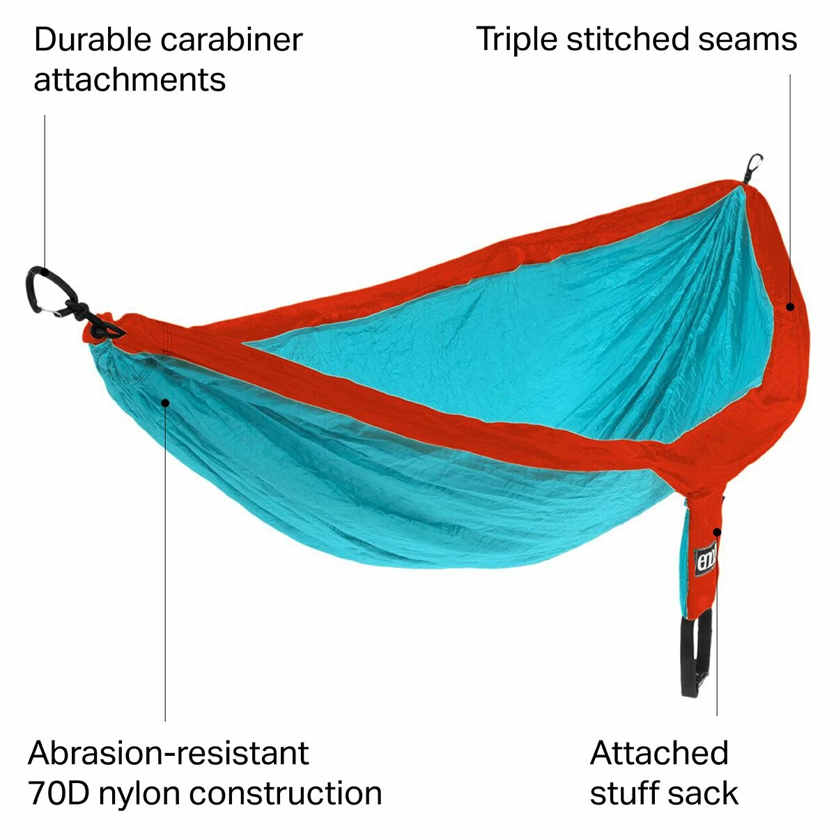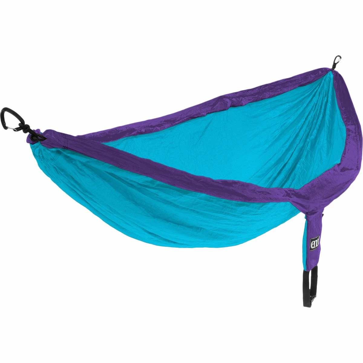 With room for two, the Eagles Nest Outfitters DoubleNest Hammock is your own portable luxury lounger for the backyard, the beach, or the backcountry. The highly packable design stuffs down to the size of a softball, and the breathable woven nylon fabric supports up to 400 pounds. Tough carabiner attachments let you clip on to your anchor of choice, for a comfortable nap or for spending the night suspended. Eagles Nest Outfitters strives to create this hammock as responsibly as possible by using every bit of fabric available; because of this, every ENO hammock will have slightly different color patterns.
