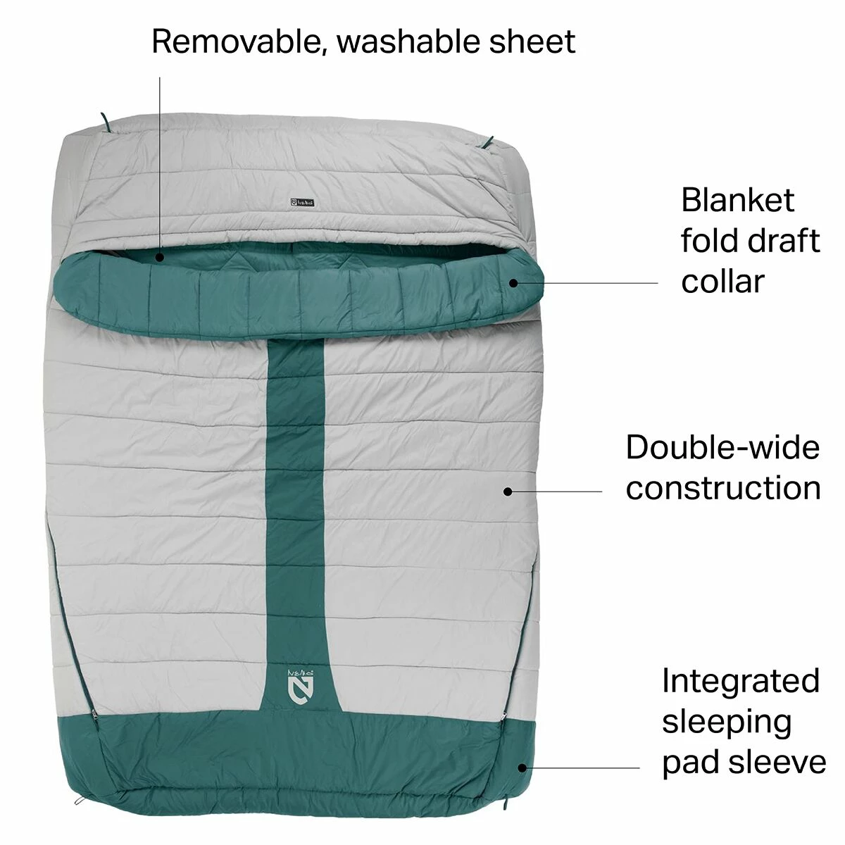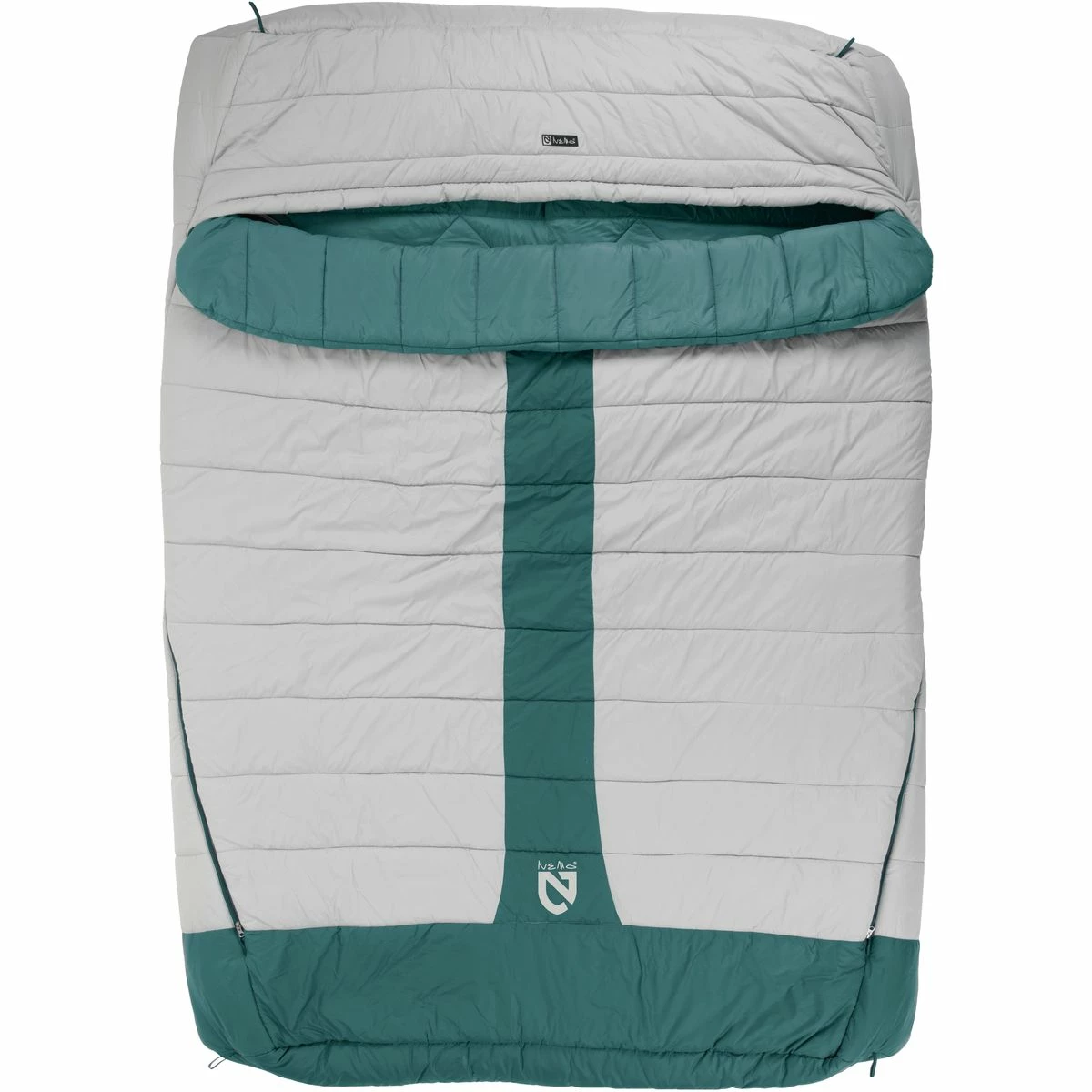 Comfort for camping companions, the double-wide construction of this bag offers room for two, and it features plenty of cuddle-worthy amenities in addition to this defining detail. Integrated pad sleeves and pillow-top quilting bring the imitation of at-home comfort full circle, allowing us to slip two regular sleeping pads beneath, or a single large one, creating a soft bed that won’t let us slip off onto the cold ground.