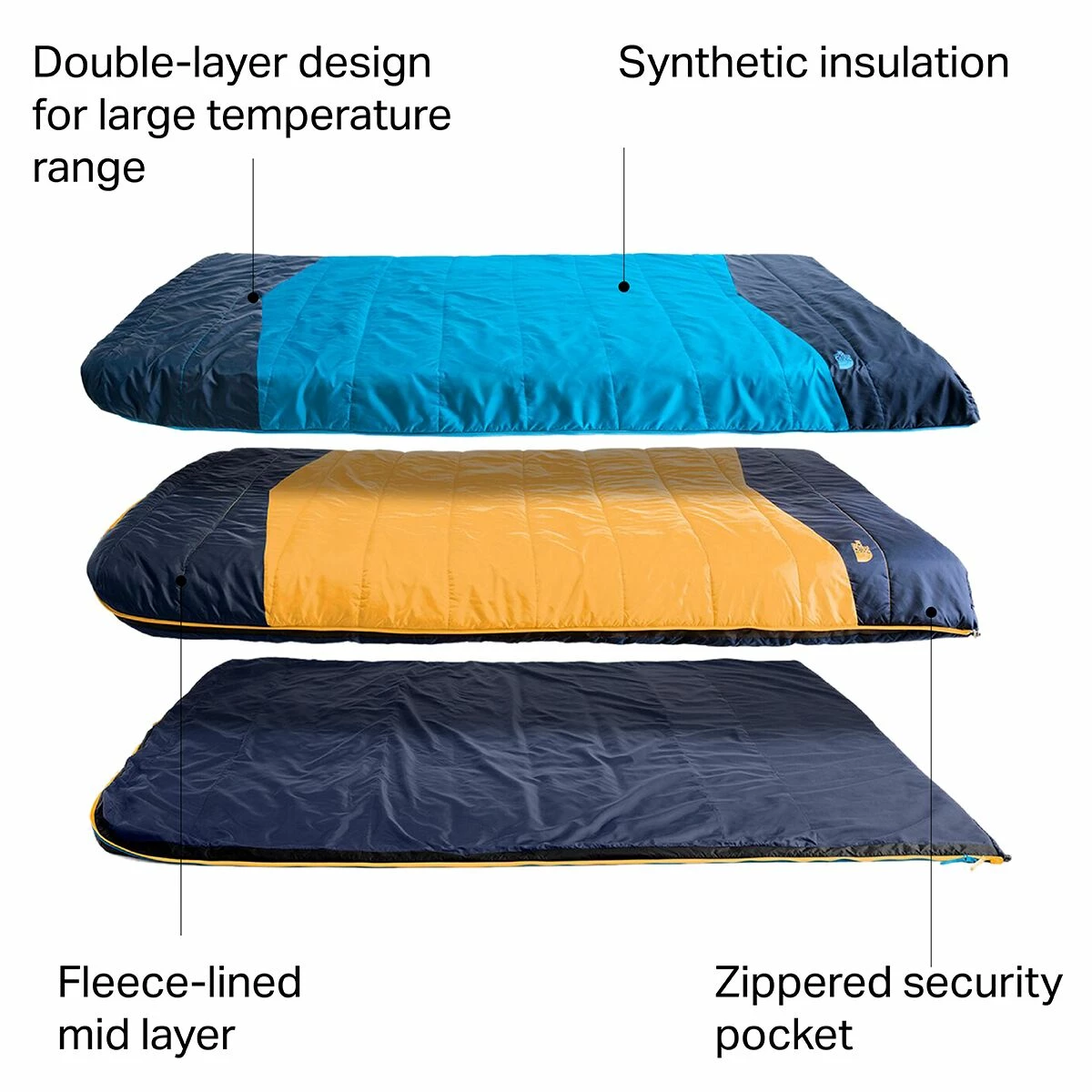 - 3-in-1 double sleeping bag with comfort for changing temps